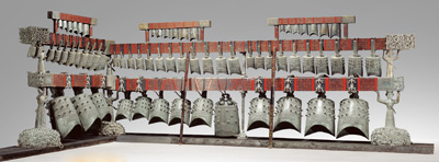 曾侯乙編鐘。1978年出土于湖北隨縣(今隨州市)曾侯乙墓,戰(zhàn)國時期青銅樂器的巔峰之作,編鐘的鐘體、鐘架和掛鐘構(gòu)件上共有3755字銘文,包含了豐富的樂律學(xué)知識。