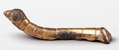 鎏金銅蠶。1984年出土于陜西安康石泉縣,體態(tài)為蠶仰頭或吐絲狀,制作精致,造型逼真,見證了開辟絲綢之路的歷史。