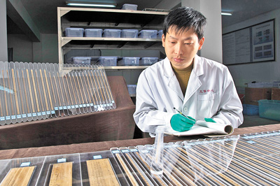 甘肅簡牘博物館的工作人員在文物庫房內(nèi)查看簡牘保存情況。