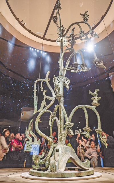 四川廣漢三星堆博物館內(nèi),觀眾圍在Ⅰ號大型銅神樹前仔細觀看。Ⅰ號大型銅神樹由底座、樹和龍三部分組成,體現(xiàn)了高超的冶鑄技術(shù)和藝術(shù)水平。