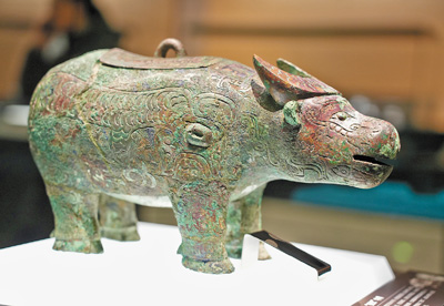 河南安陽殷墟博物館內(nèi)展出的亞長牛尊,是目前殷墟發(fā)現(xiàn)的唯一一件牛形青銅尊。