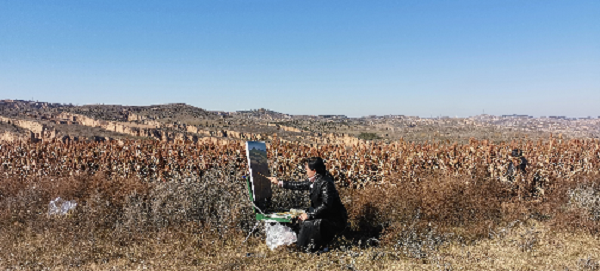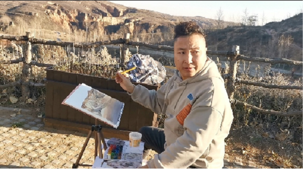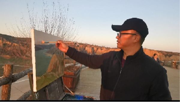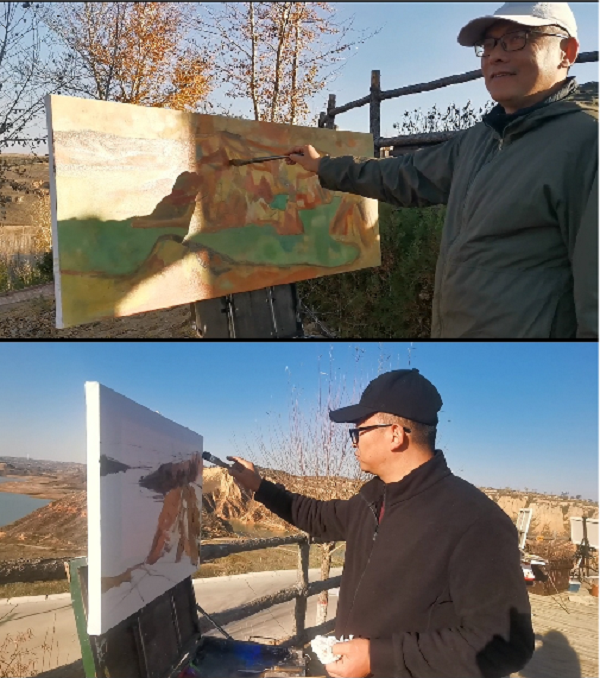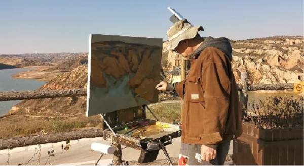 尤為幸運的是,榆林市電視臺為油畫名家郭勝利老師拍攝寫生專輯。郭勝利老師是中國美術(shù)家協(xié)會會員,陜西油畫學會常務理事,西安市美協(xié)油畫研究會副會長,西安美術(shù)學院副教授,他更是李茹主席的老師。郭老師與青年美協(xié)一起在麻黃梁房水庫開展寫生采風創(chuàng)作活動,他耐心地傳授指導:讓青年畫家們?nèi)绾斡^察周圍環(huán)境、怎樣構(gòu)圖,以及如何將眼前的景色構(gòu)成為一幅完美的畫。
