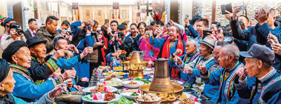 羌年期間,四川阿壩藏族羌族自治州理縣群眾吃壩壩宴。