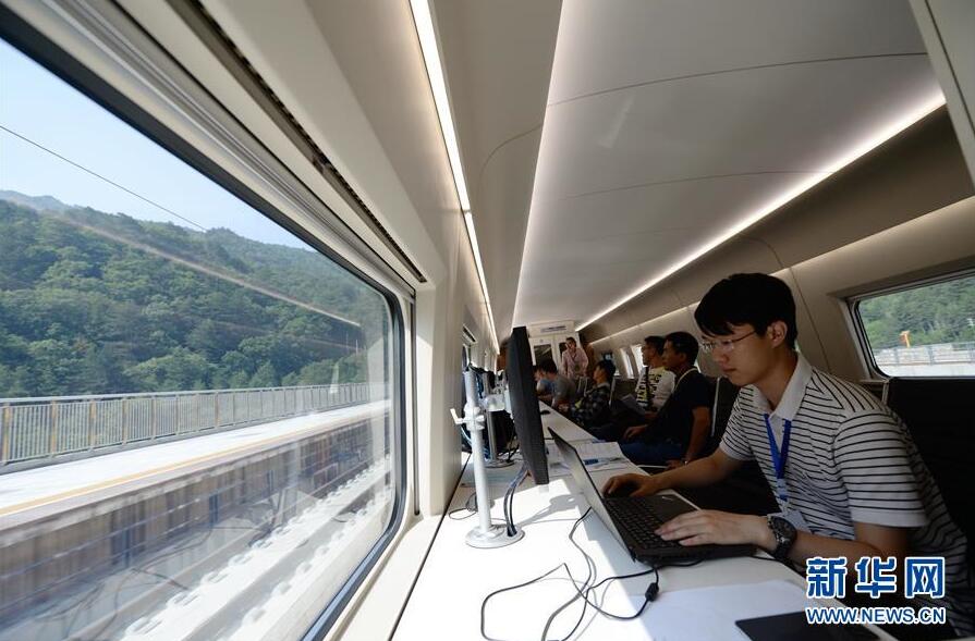 當(dāng)西成高鐵綜合檢測(cè)列車(chē)穿越秦嶺時(shí),技術(shù)人員在監(jiān)測(cè)列車(chē)運(yùn)行數(shù)據(jù)(6月20日攝)。作為首條穿越秦嶺的高鐵,西成高鐵通車(chē)在即,西安與成都之間的距離被拉近至3小時(shí)左右,以西安、成都、重慶作為支撐點(diǎn)的“西三角”經(jīng)濟(jì)圈有望進(jìn)入實(shí)質(zhì)運(yùn)作階段。新華社記者 李一博 攝