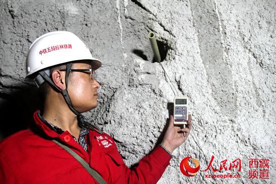 拉林鐵路全線重點(diǎn)控制工程——桑珠嶺隧道內(nèi),技術(shù)負(fù)責(zé)人玄龍通過電子設(shè)備探測隧道內(nèi)巖溫高達(dá)60.1攝氏度。袁泉 攝