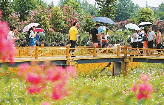 7月23日,成都市新都區(qū)軍屯鎮(zhèn)鄉(xiāng)村生態(tài)紫薇花海吸引眾多游客。該鎮(zhèn)共有15473畝耕地,多用于栽種苗木,綠化覆蓋率高達50%,是重要的花卉植物生態(tài)保護屏障,已榮獲“國家級生態(tài)鎮(zhèn)”稱號。本報記者衡昌輝攝