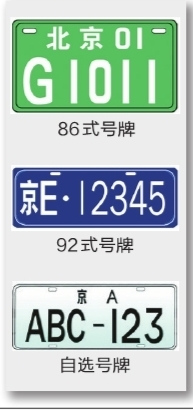建國初期,中國實(shí)行的是86式車牌,有人說是抄襲日本。這種車牌分為兩行,上面一行小字表示“發(fā)證機(jī)關(guān)代碼”,省市區(qū)全名+兩位數(shù)字序號(01–99),使館車是三位數(shù)。下面一行大字是五位編碼。小車綠牌,大車紅牌,外籍車黑牌,教練車、試驗(yàn)車藍(lán)牌,等等。