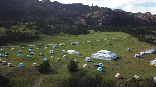 昂賽鄉(xiāng)置辦的鐵皮集裝箱、帳篷和房車,被質(zhì)疑破壞核心區(qū)生態(tài)環(huán)境。7月末,這里曾舉辦自然觀察節(jié),參與者都在這里解決食宿。澎湃新聞?dòng)浾?史含偉 圖。