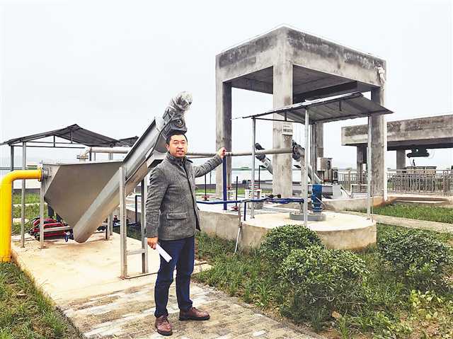 洛磧鎮(zhèn)副鎮(zhèn)長(zhǎng)楊松介紹第二污水處理廠的設(shè)施設(shè)備。記者 周尤 攝