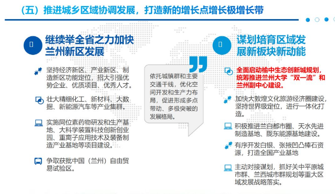 報告指出,為推進城鄉(xiāng)區(qū)域協(xié)調(diào)發(fā)展,打造新的增長點增長極增長帶,謀劃培育區(qū)域發(fā)展新板塊新動能,2019年,甘肅省全面啟動榆中生態(tài)創(chuàng)新城規(guī)劃,統(tǒng)籌推進蘭州大學“雙一流”和蘭州副中心建設,打造新興經(jīng)濟增長極。