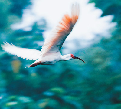 作家陳忠實曾這樣描寫朱鹮:“一襲嫩白,柔若無骨,在稻田里躑躅是優(yōu)雅的,起飛的動作是優(yōu)雅的,掠過一畦畦稻田和一座座小丘飛行在天空是優(yōu)雅的,重新落在田埂或樹枝上的動作也是一份優(yōu)雅?!?/p>