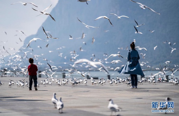 市民在昆明市草海大壩觀賞紅嘴鷗(資料照片)。新華社記者 江文耀 攝