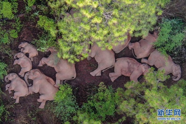 6月14日在云南省玉溪市易門縣十街鄉(xiāng)拍攝的象群(無(wú)人機(jī)照片)。新華社發(fā)