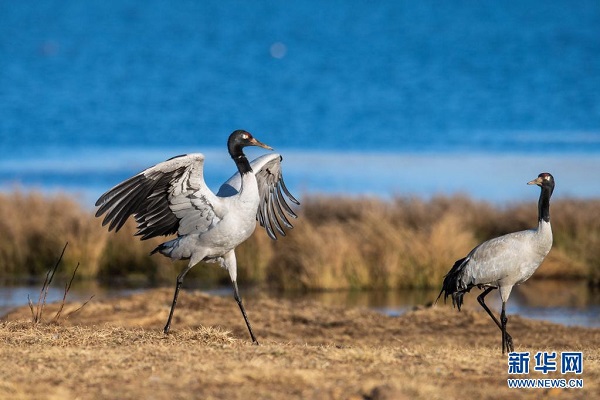 黑頸鶴在云南省昭通市大山包大海子濕地嬉戲(2月24日攝)。新華社記者 胡超 攝