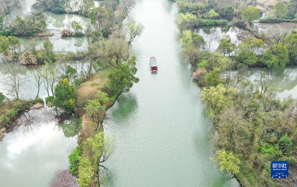 游船行駛在西溪濕地水道上(2021年3月2日攝,無(wú)人機(jī)照片)。新華社記者 翁忻旸 攝