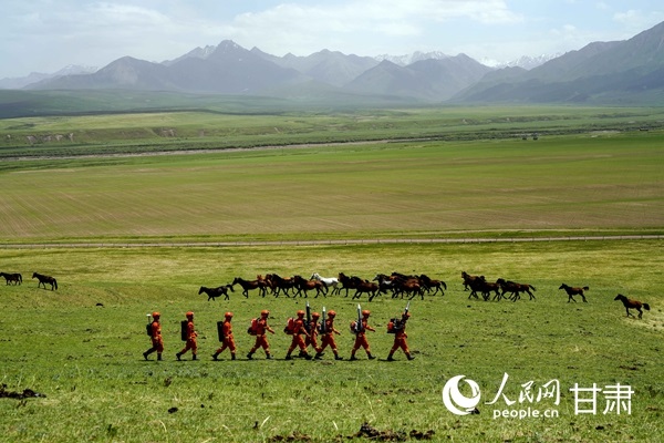 雖然守護(hù)這片草原已多年,但對(duì)于張掖市森林消防支隊(duì)甘州大隊(duì)一中隊(duì)隊(duì)長(zhǎng)助理牛向平來(lái)說(shuō),每一次巡護(hù)都是一次全新的“旅程”:“我們每次巡護(hù)的區(qū)域、路線都不一樣,很多地方車進(jìn)不去,執(zhí)勤隊(duì)員們都背著幾十斤的裝備徒步行進(jìn)?!闭f(shuō)話間,一位入隊(duì)不久的隊(duì)員摔倒了,牛向平趕忙上前扶起他并提醒大家注意安全。