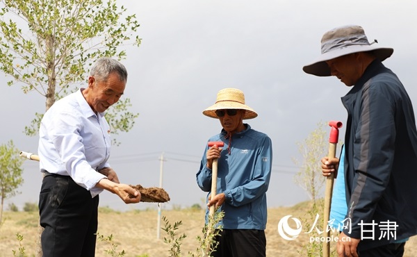 天氣干旱,郭萬(wàn)剛(左一)來(lái)到治沙點(diǎn),捧起一抔土,和林場(chǎng)工人一起查看墑情。人民網(wǎng)王文嘉攝