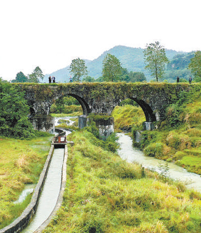 通濟堰始建于南朝梁天監(jiān)年間,是目前我國已知年代最早的拱形堰壩,壩上還專門留有放排通船的“船缺”。進(jìn)水閘下游300米處干渠上,始建于宋代的“石函引水橋”沿用至今,渠水在函下自西向東流,一條山溪在函上自北而南行,互不干擾。它的建成避免了山洪泥石流對引水干渠的頻繁淤積,大大節(jié)省了疏浚維護(hù)成本,這也是我國現(xiàn)存年代最早的水系立交工程。