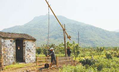 浙江諸暨泉畈村,村民正在使用桔槔從拗井里提水進(jìn)行灌溉。