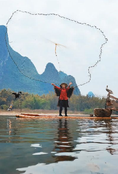 漓江上的捕魚表演成了許多游客的“打卡”項目。本報記者 祝佳祺攝