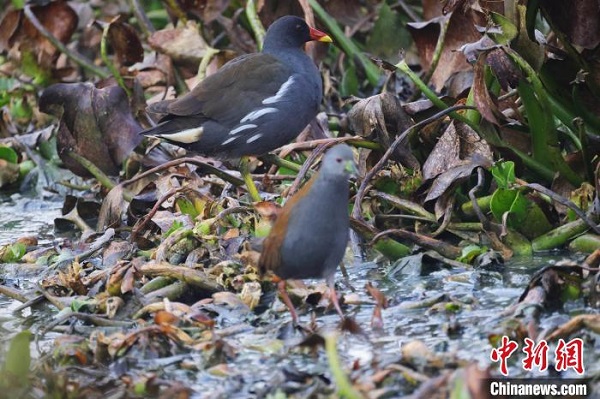 “黑水雞上岸像雞,下水似鴨子?!痹l(wèi)介紹。黑水雞又名江雞、紅骨頂,體羽呈黑色,額甲和喙呈亮紅色,遠(yuǎn)看就像縮小版的黑天鵝。黑水雞善于游泳,上岸后可以像家雞在陸地上快速奔跑、覓食。棕背田雞又名黑尾苦惡鳥,頭頸和下體深灰色,頂和枕部顏色較暗,頭側(cè)顏色較淡,雄雌同色。它們都喜棲息于富有蘆葦和水生挺水植物的沼澤、湖泊、水庫、葦塘和水渠等淡水濕地。