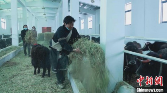 圖為多村“一合”牧民聯(lián)合專業(yè)合作社工作人員給牦牛喂飼料。益西 攝