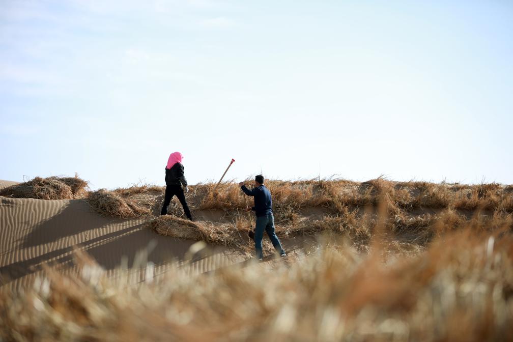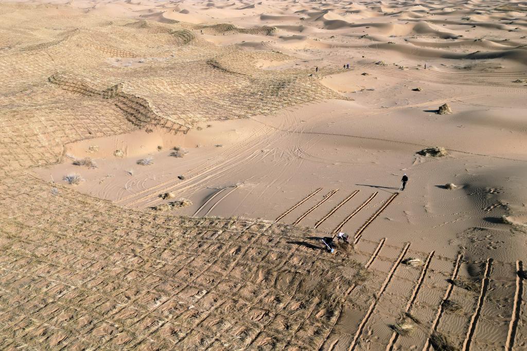 在甘肅省武威市民勤縣東湖鎮(zhèn)境內(nèi)的騰格里沙漠西緣,工人進(jìn)行工程固沙。新華社記者張智敏攝