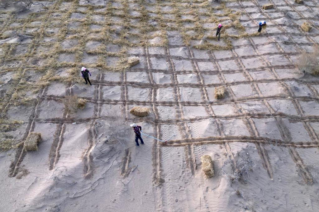 從去年秋天起,民勤縣就發(fā)動廣大干部群眾,打好治沙“提前量”。在沙丘上用麥草壓埋好方格沙障,為今春沙生植物梭梭生長做足準(zhǔn)備。同時,當(dāng)?shù)孛刻於紩才?00多名技術(shù)人員,在各個沙區(qū)現(xiàn)場指導(dǎo)綠化作業(yè)。
