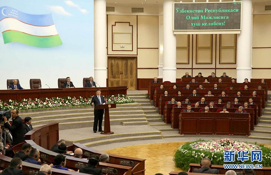 當(dāng)?shù)貢r間下午3時50分許,習(xí)近平抵達(dá)最高會議立法院,烏茲別克斯坦總統(tǒng)卡里莫夫、最高會議參議院主席尤爾達(dá)舍夫、最高會議立法院主席伊斯莫伊洛夫在停車處迎接。習(xí)近平步入演講大廳。聽眾們?nèi)w起立,鼓掌歡迎。伊斯莫伊洛夫歡迎習(xí)近平到訪最高會議立法院。在熱烈的掌聲中,習(xí)近平發(fā)表演講。