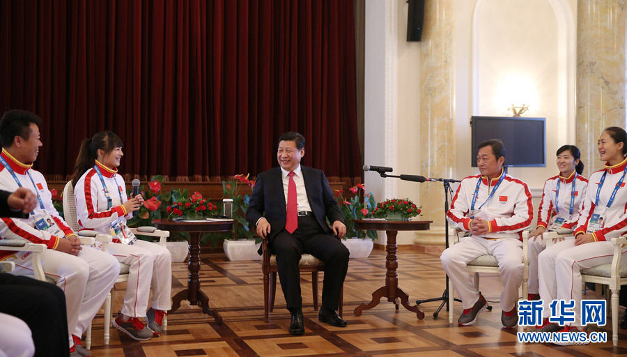 圖為:2014年2月7日,中共中央總書記、國家主席、中央軍委主席習近平在俄羅斯索契親切看望參加第二十二屆冬季奧林匹克運動會的中國體育代表團。