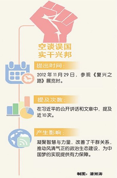 “事實(shí)是真理的依據(jù),實(shí)干是成就事業(yè)的必由之路。這也是‘空談?wù)`國(guó),實(shí)干興邦’的真諦?!绷?xí)近平這樣闡釋。