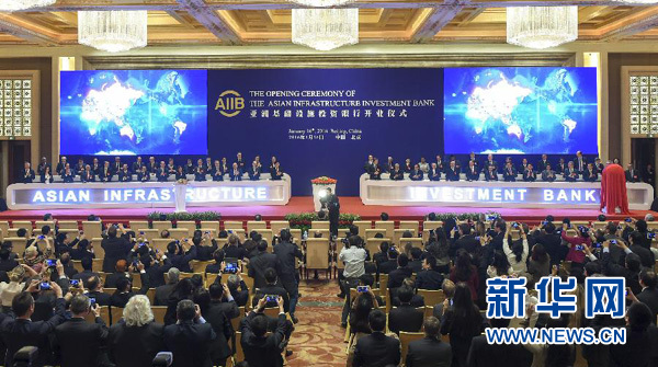 亞洲基礎(chǔ)設(shè)施投資銀行開(kāi)業(yè)儀式在北京舉行,來(lái)自57個(gè)創(chuàng)始成員國(guó)的代表共同按下啟動(dòng)鍵(2016年1月16日攝)。 新社記者謝環(huán)馳攝