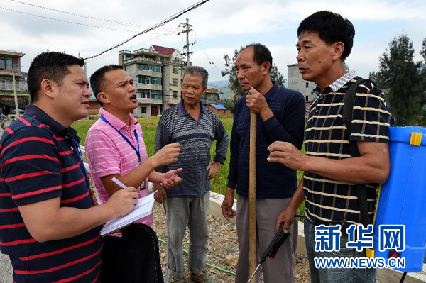 福建連江縣紀(jì)委“農(nóng)村工作室”工作人員(左一、左二)在浦口鎮(zhèn)益砌村落實(shí)一處信訪件反映的情況(2015年9月15日攝)。 新華社記者張國(guó)俊攝