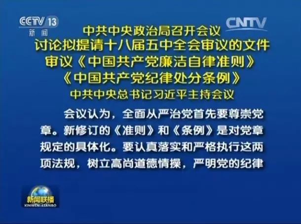 ?新華網(wǎng)北京10月12日電 中共中央政治局10月12日召開會議,研究制定國民經(jīng)濟(jì)和社會發(fā)展第十三個五年規(guī)劃重大問題,審議通過《中國共產(chǎn)黨廉潔自律準(zhǔn)則》、《中國共產(chǎn)黨紀(jì)律處分條例》。中共中央總書記習(xí)近平主持會議。