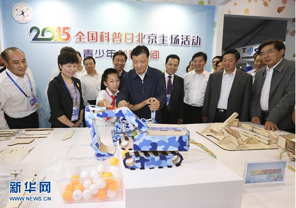 9月19日,中共中央政治局常委、中央書記處書記劉云山在北京奧林匹克公園參加全國科普日北京主場活動。這是劉云山在青少年創(chuàng)新空間展區(qū)了解和體驗小學(xué)生們自制液壓挖掘機的制作過程。新華社記者 丁林 攝