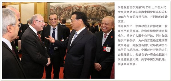 2015年3月,時(shí)隔一年,李克強(qiáng)總理再次會(huì)見(jiàn)來(lái)華出席中國(guó)發(fā)展高層論壇年會(huì)的境外代表。