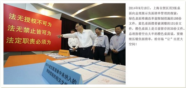 在2014年夏季達(dá)沃斯的開(kāi)幕致辭中,李克強(qiáng)詳解本屆政府開(kāi)出的三張“清單”:政府要拿出“權(quán)力清單”,明確政府該做什么,做到“法無(wú)授權(quán)不可為”;給出“負(fù)面清單”,明確企業(yè)不該干什么,做到“法無(wú)禁止皆可為”;理出“責(zé)任清單”,明確政府該怎么管市場(chǎng),做到“法定責(zé)任必須為”。