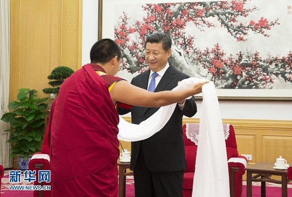 班禪向習(xí)近平敬獻(xiàn)了哈達(dá),并介紹了他坐床20年來的情況,習(xí)近平對他在各方面取得的進(jìn)步表示祝賀。