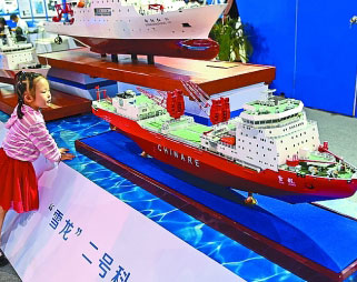 第二十一屆中國北京國際科技產(chǎn)業(yè)博覽會集中展示高精尖科技成果,分享科技產(chǎn)業(yè)發(fā)展新理念新模式新思路。圖為小朋友在仔細(xì)打量“雪龍”二號科考船模型。新華社發(fā)