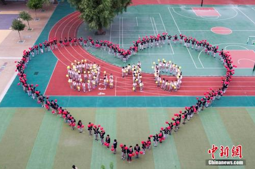 資料圖:教師節(jié),老師們牽著學(xué)生的手走過(guò)紅地毯步入校園。張?jiān)?攝
