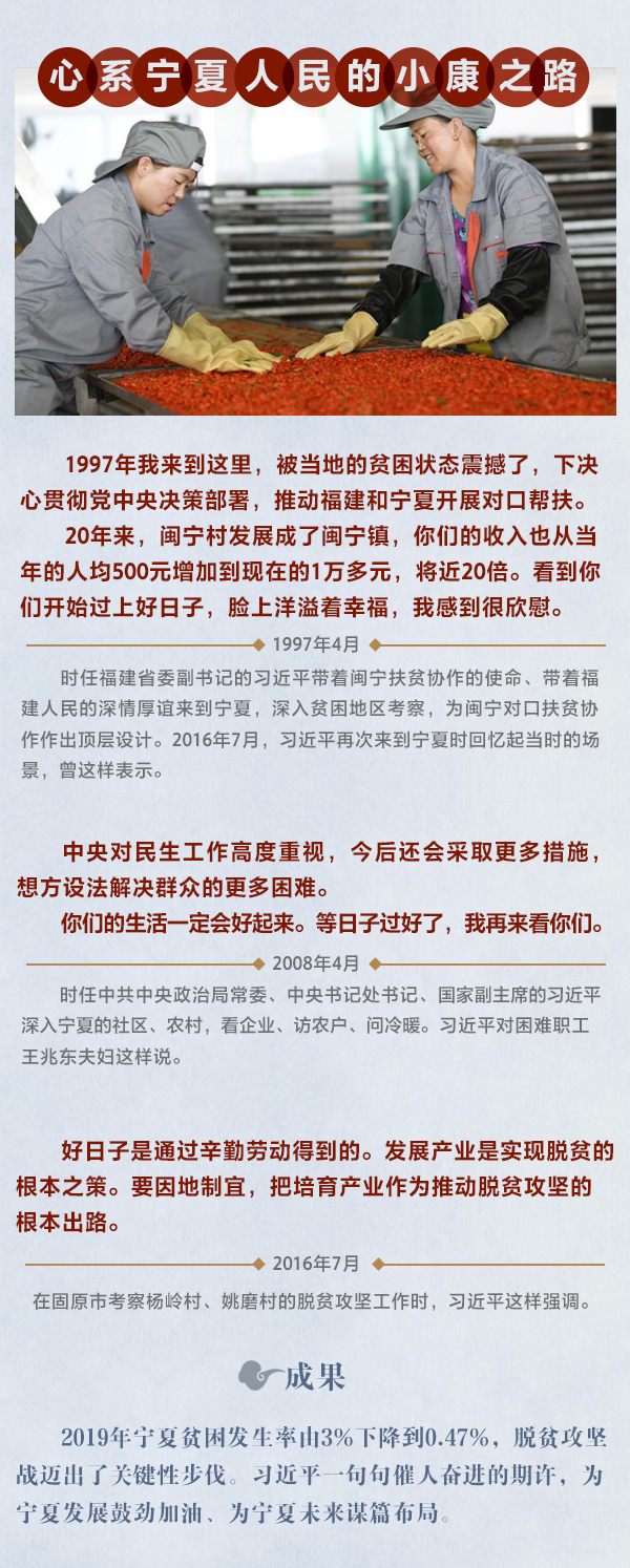 對于寧夏的發(fā)展,習(xí)近平有著一份特殊的牽掛。1997年4月,作為福建省委副書記、同時也是福建省對口幫扶寧夏領(lǐng)導(dǎo)小組組長的習(xí)近平第一次來到寧夏。此后,他曾于2008年和2016年兩次來寧夏考察調(diào)研。