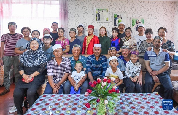 這是家住內(nèi)蒙古呼倫貝爾的夏民山(前排右三)家的家庭合影。他家由回族、漢族、蒙古族、達斡爾族、鄂溫克族、滿族共6個民族組成,45口人,三代同堂(2017年7月16日攝)。新華社記者 連振 攝