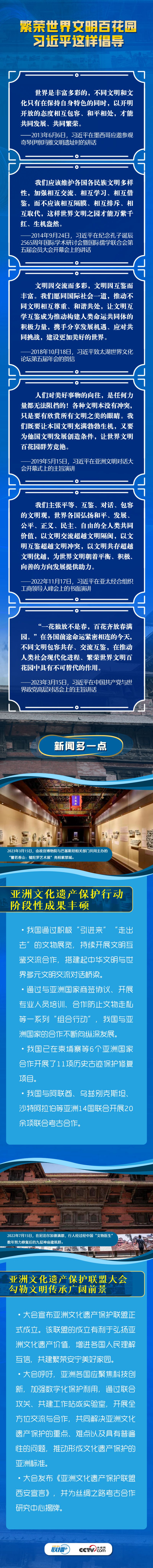2019年,習(xí)近平主席在亞洲文明對話大會上倡議開展亞洲文化遺產(chǎn)保護(hù)行動。4年來,各方積極響應(yīng)、共同努力,務(wù)實(shí)合作取得豐碩成果。今年,習(xí)近平主席提出“共同倡導(dǎo)尊重世界文明多樣性,共同倡導(dǎo)弘揚(yáng)全人類共同價值,共同倡導(dǎo)重視文明傳承和創(chuàng)新,共同倡導(dǎo)加強(qiáng)國際人文交流合作”的全球文明倡議,為推動人類社會現(xiàn)代化進(jìn)程、繁榮世界文明百花園提供了極具時代意義的中國方案。央視網(wǎng)《聯(lián)播+》特擷取習(xí)主席關(guān)于“繁榮世界文明”的重要論述,與您一起學(xué)習(xí)。