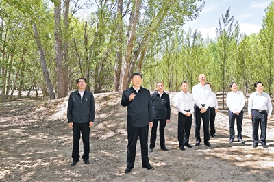 6月5日至6日,中共中央總書記、國家主席、中央軍委主席習近平在內蒙古巴彥淖爾考察,并主持召開加強荒漠化綜合防治和推進“三北”等重點生態(tài)工程建設座談會。這是6日上午,習近平在臨河區(qū)國營新華林場考察。