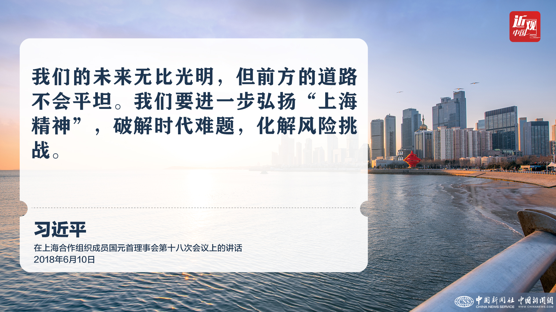 2018年6月10日,上海合作組織成員國元首理事會(huì)第十八次會(huì)議在中國山東省青島市舉行。中國國家主席習(xí)近平主持會(huì)議并發(fā)表題為《弘揚(yáng)“上海精神” 構(gòu)建命運(yùn)共同體》的重要講話。習(xí)近平表示,當(dāng)前,世界發(fā)展既充滿希望,也面臨挑戰(zhàn),我們的未來無比光明,但前方的道路不會(huì)平坦。我們要進(jìn)一步弘揚(yáng)“上海精神”,破解時(shí)代難題,化解風(fēng)險(xiǎn)挑戰(zhàn)。
