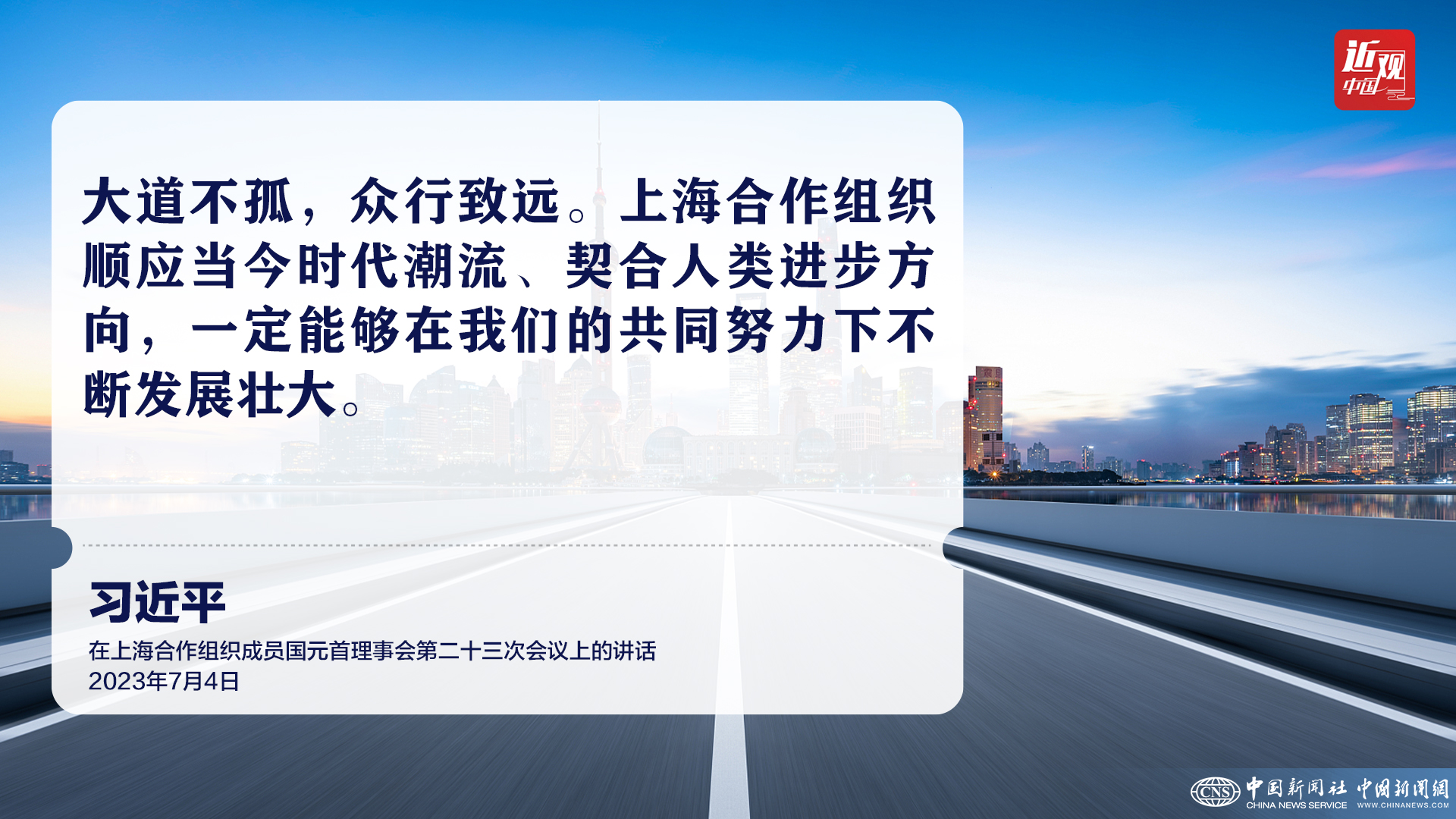 2023年7月4日下午,中國國家主席習(xí)近平在北京以視頻方式出席上海合作組織成員國元首理事會(huì)第二十三次會(huì)議并發(fā)表題為《牢記初心使命 堅(jiān)持團(tuán)結(jié)協(xié)作 實(shí)現(xiàn)更大發(fā)展》的重要講話。習(xí)近平強(qiáng)調(diào),大道不孤,眾行致遠(yuǎn)。上海合作組織順應(yīng)當(dāng)今時(shí)代潮流、契合人類進(jìn)步方向,一定能夠在我們的共同努力下不斷發(fā)展壯大。