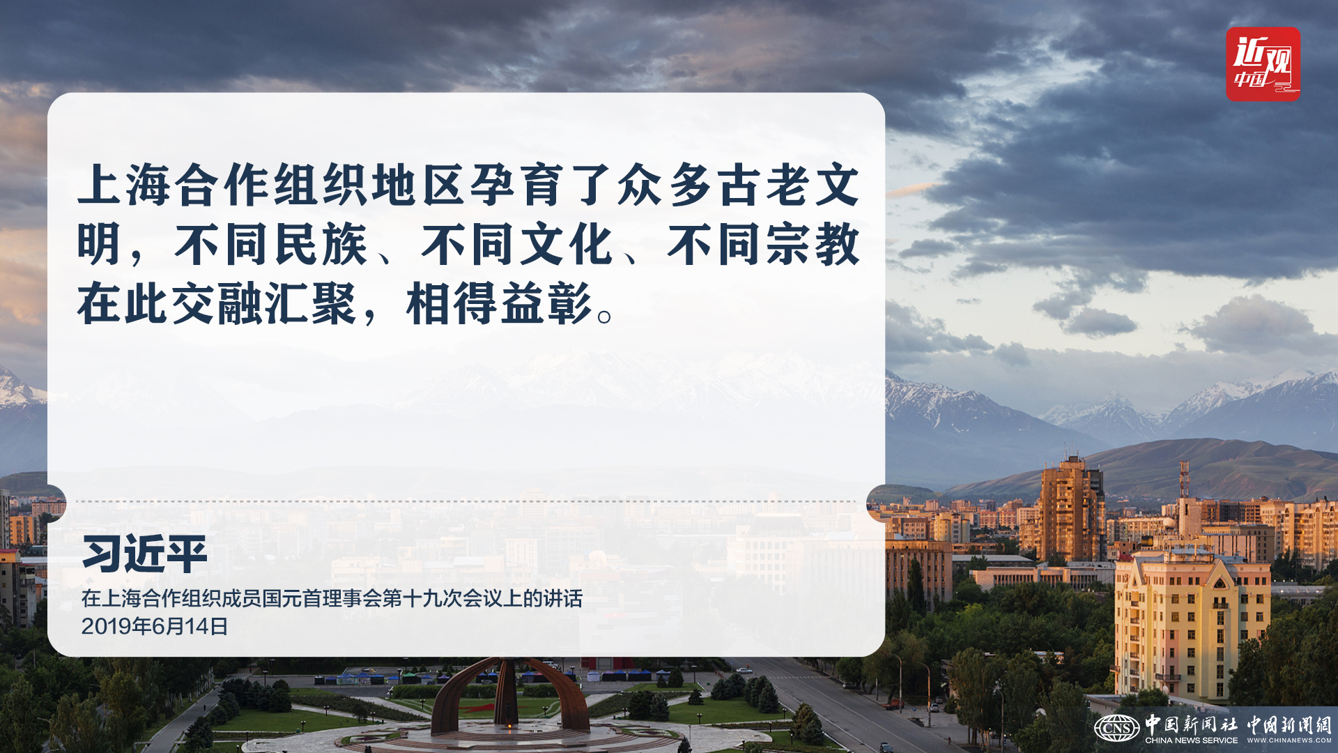 2019年6月14日,上海合作組織成員國元首理事會(huì)第十九次會(huì)議在吉爾吉斯斯坦首都比什凱克舉行。中國國家主席習(xí)近平出席會(huì)議并發(fā)表題為《凝心聚力 務(wù)實(shí)篤行 共創(chuàng)上海合作組織美好明天》的重要講話。習(xí)近平指出,我們要把上海合作組織打造成包容互鑒的典范。上海合作組織地區(qū)孕育了眾多古老文明,不同民族、不同文化、不同宗教在此交融匯聚,相得益彰。我們要珍惜本地區(qū)文明多樣性這一寶貴財(cái)富,摒棄文明沖突,堅(jiān)持開放包容、互學(xué)互鑒,為各國人民世代友好、共同發(fā)展進(jìn)步注入持久動(dòng)力。