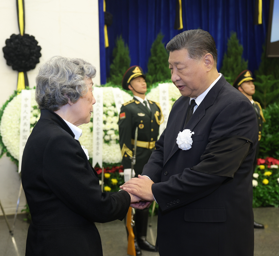 ??上午9時30分許,習(xí)近平、趙樂際、王滬寧、蔡奇、丁薛祥、李希、韓正等,在哀樂聲中緩步來到吳邦國同志的遺體前肅立默哀,向吳邦國同志的遺體三鞠躬,并與吳邦國同志親屬一一握手,表示慰問。胡錦濤送花圈,對吳邦國同志逝世表示哀悼。