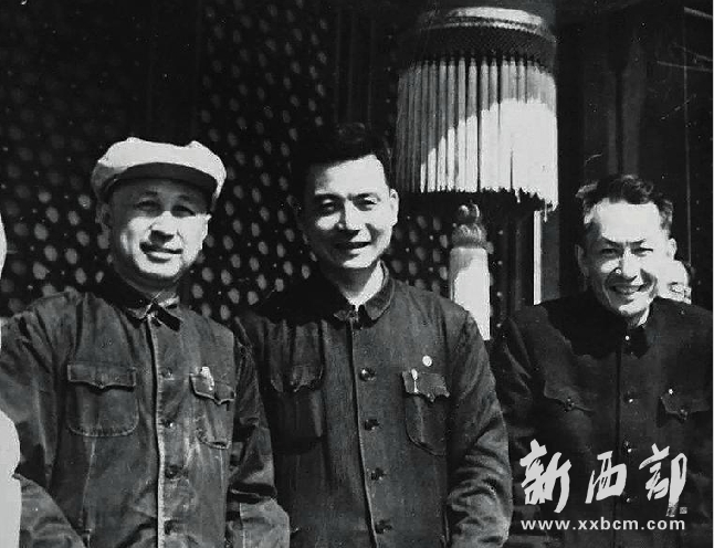 1966年國慶節(jié),鄧稼先(中)、錢學(xué)森(左)和朱光亞(右)在天安門城樓上