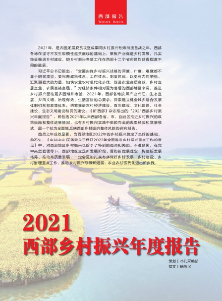 習(xí)近平總書記指出:“全面實施鄉(xiāng)村振興戰(zhàn)略的深度、廣度、難度都不亞于脫貧攻堅,要完善政策體系、工作體系、制度體系,以更有力的舉措、匯聚更強大的力量,加快農(nóng)業(yè)農(nóng)村現(xiàn)代化步伐,促進(jìn)農(nóng)業(yè)高質(zhì)高效、鄉(xiāng)村宜居宜業(yè)、農(nóng)民富裕富足。”對經(jīng)濟(jì)條件相對更為落后的西部地區(qū)來說,推進(jìn)鄉(xiāng)村振興面臨更多困難和考驗。2021年,西部各地按照產(chǎn)業(yè)興旺、生態(tài)宜居、鄉(xiāng)風(fēng)文明、治理有效、生活富裕的總要求,探索建立健全城鄉(xiāng)融合發(fā)展體制機(jī)制和政策體系,統(tǒng)籌推進(jìn)農(nóng)村經(jīng)濟(jì)建設(shè)、政治建設(shè)、文化建設(shè)、社會建設(shè)、生態(tài)文明建設(shè)和黨的建設(shè)?!缎挛鞑俊冯s志推出的“2021西部鄉(xiāng)村振興年度報告”,既包括2021年以來西部各省、市、自治區(qū)推進(jìn)鄉(xiāng)村振興的政策措施和整體進(jìn)展情況,也有鄉(xiāng)村振興實踐中脫穎而出的典型經(jīng)驗和發(fā)展模式,是一個較為全面地反映西部鄉(xiāng)村振興整體風(fēng)貌的研究報告。